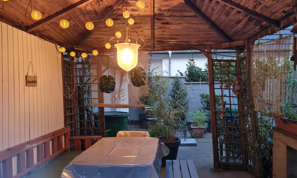 Dagegen ist die zweite Hofhälfte jetzt aufgeräumt. Der Pavillon ist mehr als zwanzig Jahre alt und zeigt deutliche Schwächen in den Punkten Regenfestigkeit und Stabilität, aber er hält sich noch tapfer.