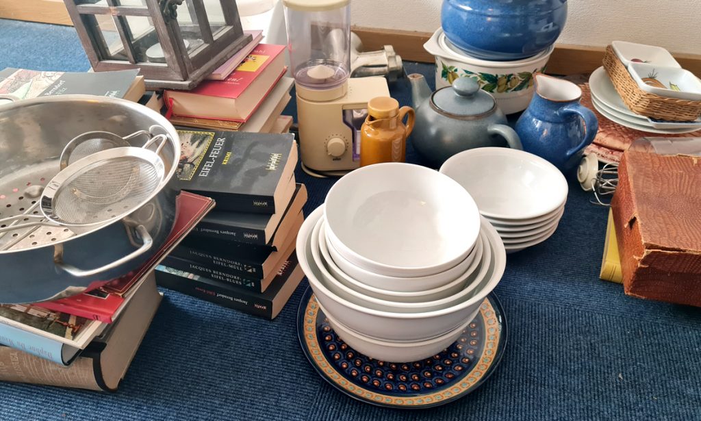 Immer wieder sage ich mir, dass der ganze Kram, den ich jetzt mitnehme, irgendwann von meinen eigenen Kindern mühevoll aussortiert werden muss. Das hilft, um während des Durchsehens der Schränke auch wegzuwerfen. Jahrelang gesammelte Kunstkalender landen im Papiermüll. Das tut mir fast schon weh, am liebsten würde ich sie behalten, aber sie wurden in den letzten zwanzig Jahren schon bei meinen Eltern nur gestapelt und nicht mehr angesehen, da möchte ich nicht, dass das bei mir so weitergeht. Gesammelte Sachen, die ich nur aufbewahre und nicht wirklich nutze, habe ich selber schon genug.