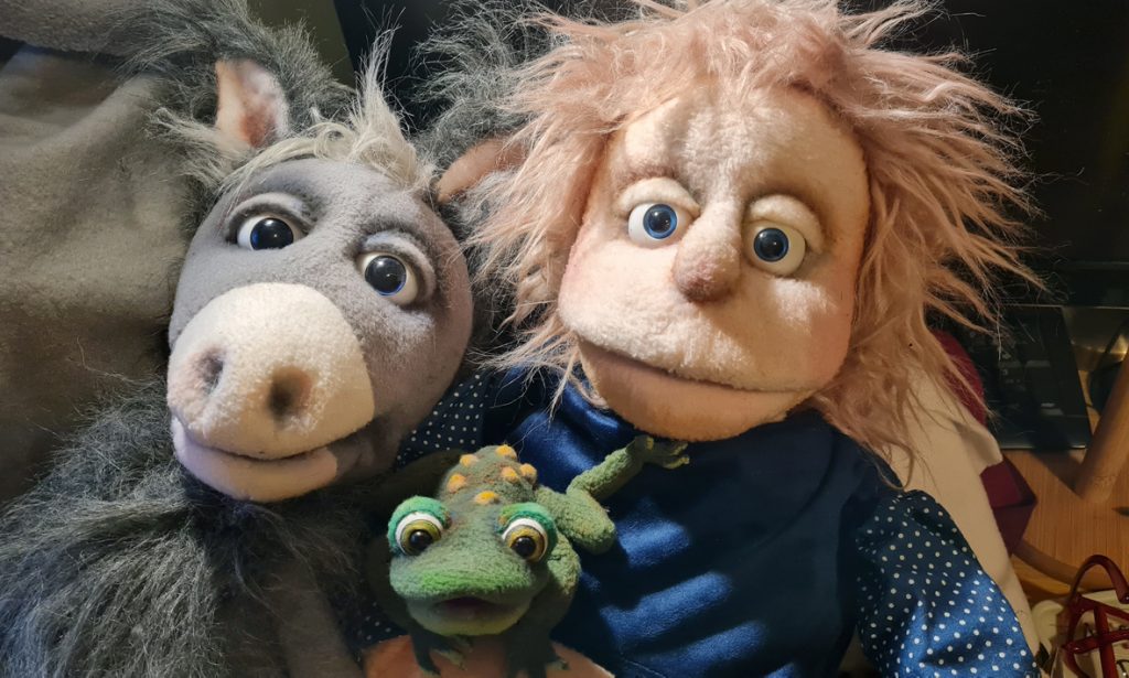 Als alle Nähte gemacht sind, greife ich zu den Farben, um Gesichter, Hände und Beine etwas zu kolorieren. Das macht sie noch ausdrucksstärker. Zum Schluss nähe ich die Beine an. Das ist ein bisschen Arbeit, denn ich muss sie am runden Körper befestigen und trotzdem müssen sie parallel sein, gleich lang werden und mit den Füßen gerade nach vorne stehen. Kaum baumeln sie schön, entscheide ich, dass ich sie nicht haben möchte. Das ganze Stück über dieses Gebummsel der Beine, nur um damit eine kurze Szene zu spielen, ist mir zu anstrengend und schränkt mich womöglich bei anderen Szenen ein. Ich trenne die Beine wieder ab – was viel schneller als annähen geht – und streiche die Bein-Stelle aus dem Stück. Dabei lasse ich mir offen, ob ich sie irgendwann wieder reinschreibe, denn sie ist schon lustig. Vielleicht finde ich später, dass ich nicht auf sie verzichten sollte.