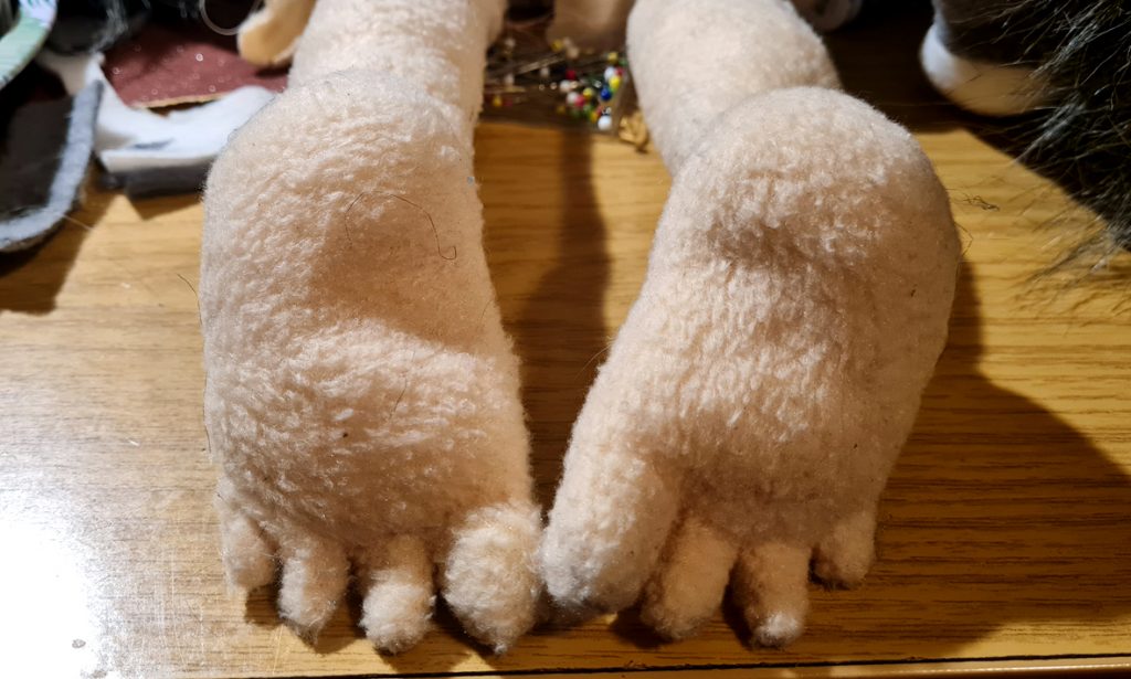 Bei meinem Puppenstück kann ich gerade nicht mit vollem Schwung dran sein, aber es soll zumindest immer etwas weitergehen. Ich nähe die Beine komplett fertig, die eine der Figuren für eine einzige, kurze Szene im Stück braucht. Eigentlich braucht sie nur ein Bein, aber falls Kinder die Puppe nach dem Stück mal ansehen, wirft es Fragen auf, wenn sie dann einbeinig ist. „Das war mir zu viel Arbeit“ ist da keine Erklärung.