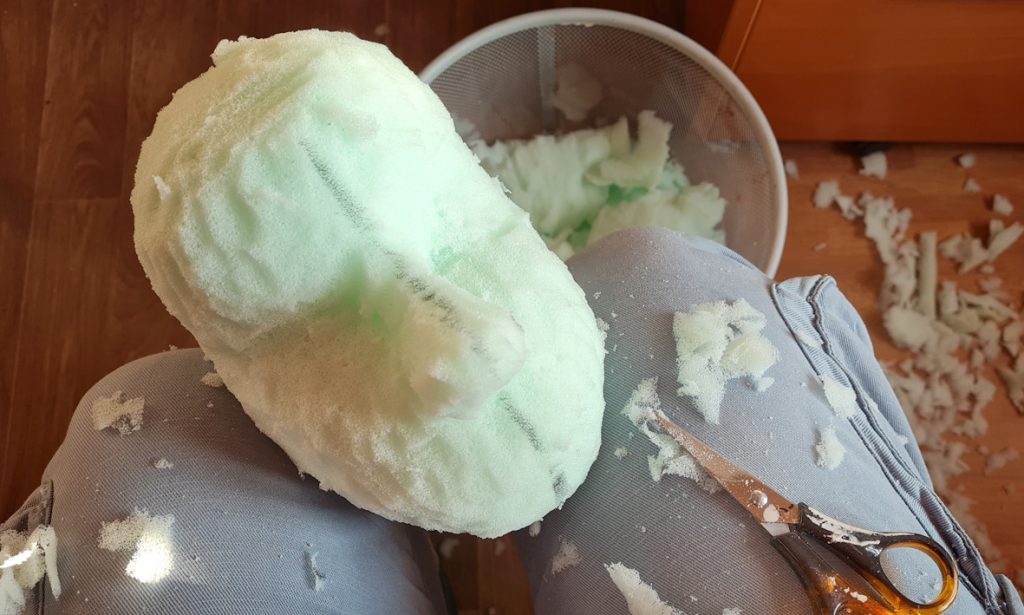 Weil niemand außer mir Zuhause ist, setze ich mich gemütlich ins Wohnzimmer, schnippel Schaumstoff.