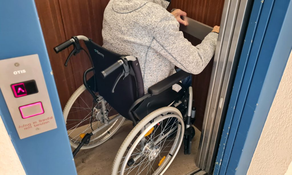 Als ich am nächsten Morgen aufwache, geht es mir deutlich besser. Die Knie tun weniger weh, die Kopfschmerzen sind weg. Ein etwas wattiger Kreislauf und leichte Übelkeit sind weiterhin latent vorhanden und ein wenig müde bin ich immer noch. Aber das ist doch schon gut. Dass ich mich besser fühle, ist doppelt gut, denn mein Vater hat seinen vorverschobenen Arzttermin. Ich fahre zu ihm, packe ihn und den Rollstuhl ins Auto, schiebe ihn bis zum „barrierefreien“ Arzt – und stehe dann vor einem der kleinsten Fahrstühle der Welt, in den ich den Rollstuhl nur reinbekomme, indem ich die Fußstützen abmontiere, mein Vater seine Füße gequetscht nach innen dreht und der Rollstuhl nach Hin- und Hergeruckle sowohl vorne als auch hinten an die Wand stößt. Beim Schließen schabt die Tür am Reifen entlang und ich hoffe, dass das kein Auslöser zum Steckenbleiben sein wird. Ich selber passe nicht dazu und bin froh, dass ich die Stufen im Treppenhaus wieder einigermaßen gut laufen und meinen Vater oben empfangen kann.