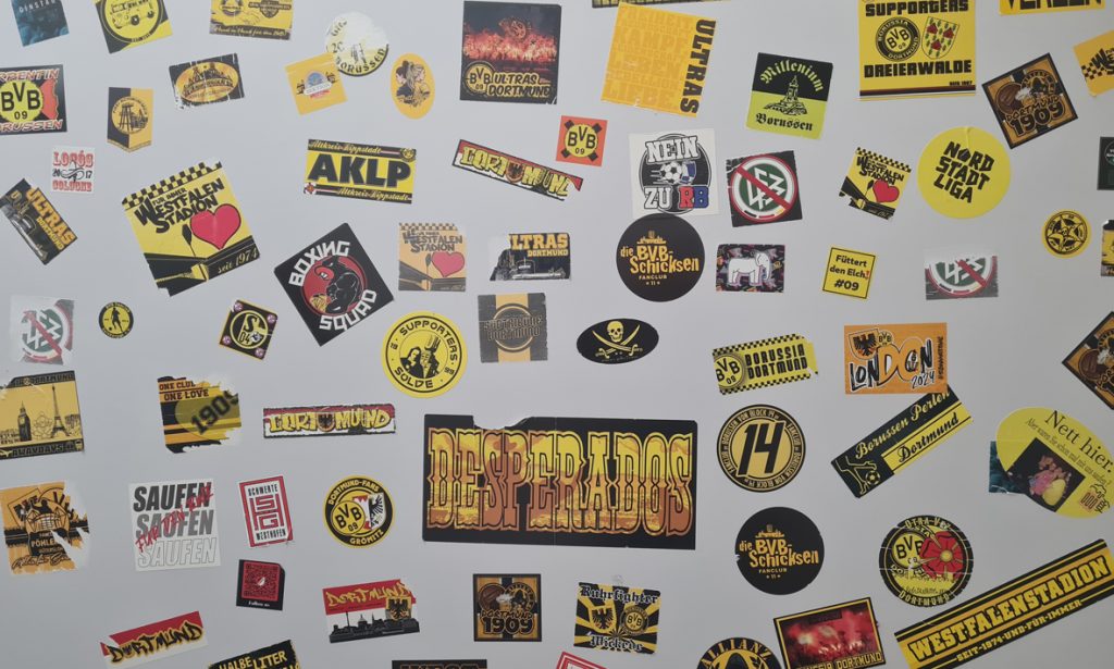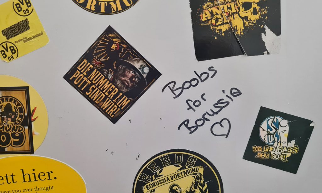 Aufkleberkleben scheint für die Fans eine Art der Reviermarkierung zu sein, was auch die Damentoilette auffrischt. „Es lädt zum Verweilen ein“, würden Raumausstatter säuseln.