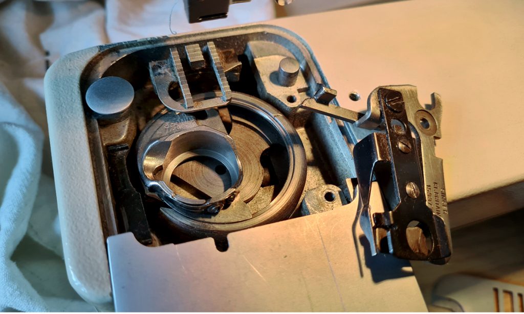 Meine Stimmung steigt, als ich den Faden entfernen und alle Teile wieder passend einsetzen kann. Schnell drehe ich die letzten Schrauben fest, doch da merke ich, dass die Spule für den Unterfaden komplett locker sitzt. Also nochmal alles raus, Spule fest einsetzen und beim Verschrauben mit Druck an ihrem Platz halten. Sieh mal an, als Feinmechanikerin bin ich gar nicht so ungeeignet. Ich habe keine Ahnung, was warum und wie zusammenhängt, aber ich kann es wieder zusammenpuzzeln. Da bin ich jetzt doch ein bisschen stolz. Als ich nähen will, bewegt sich die Nadel wieder vorbildlich auf und ab, die Unterspule sitzt jetzt aber komplett fest und gibt keinen Faden dazu. Ach, menno! Doppel-Menno! Vielleicht fehlt ja Öl und darum klemmt es? Ich habe die Maschine gebraucht gekauft und da stand sie vermutlich schon Jahrzehnte ungenutzt im Schrank. Aber jetzt alles auseinanderbauen, säubern und ölen? Da geht ja total viel Zeit drauf. Die habe ich gerade nicht.