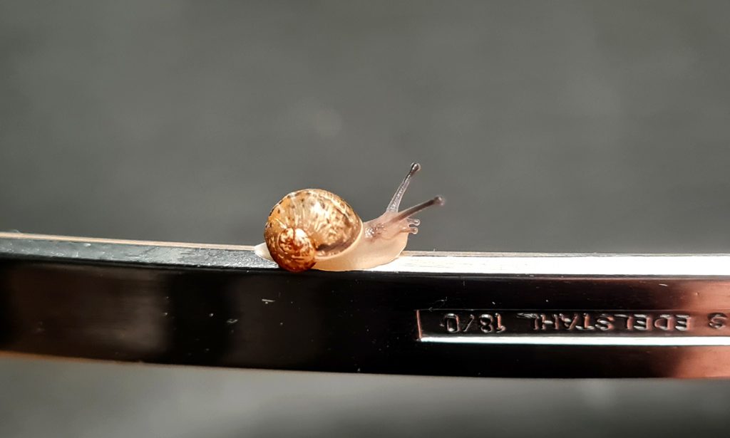 Im Garten ernte ich eine Schüssel voll Trauben von fünf verschiedenen Rebsorten. Zwei sind ganz gut, hätten aber mehr Sonne gebrauchen können, eine ist ziemlich sauer, aber die dunklen Muskatellertrauben von der Laube sind süß und haben intensiven Geschmack und die roten Vanessatrauben vom Zaun sind sehr erfrischend lecker und knackigsüß. Wie gut, dass ich mir alle Trauben gut angucke, bevor ich sie esse, denn mittendrin sitzt eine winzigkleine Babyschnecke. Die hätte zwischen den Zähnen vermutlich nur mal kurz geknackt und ich hätte sie für einen Kern gehalten. Ich lasse sie auf einen Löffelstiel kriechen, der unter ihr wie ein Stahlträger aussieht, und bringe sie in den Garten. Dass so winzigkleine Schnecken schon so perfekt aussehen!