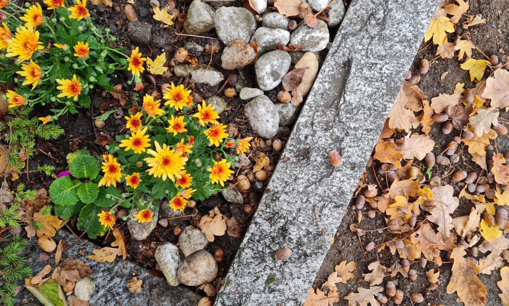 Auf dem Friedhof befreie ich das Grab meiner Großeltern von vielen Herbstblättern und Nüssen und pflanze kleine Astern. Währenddessen segeln von oben weiterhin herbstliche Blätter herab und im Sekundentakt schlagen mit lautem Plopp Nüsse um mich herum auf. Spätestens am nächsten Tag wird das Grab wieder eine Blätter-Nüsseschicht haben.