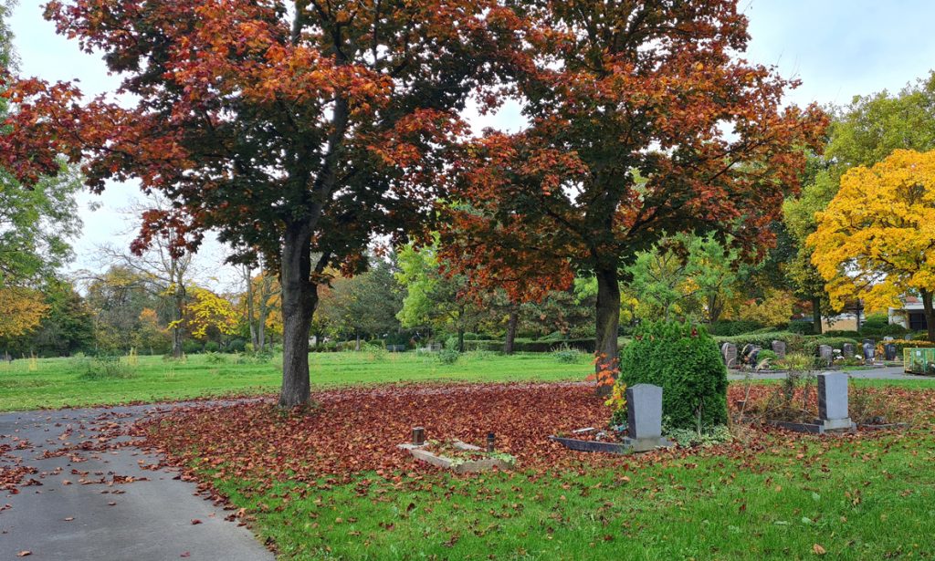 Es ist jetzt Herbst und die bis dahin dicht belaubten Bäume verlieren programmgemäß ihre Blätter. Weil aber kein Wind weht, bleiben sie kreisförmig angeordnet unter ihren Bäumen liegen. Auf dem Friedhof müssen manche Gräber, die unter großen Ahornbäumen liegen, aus hohen, gelben Blätterhügeln herausgeschaufelt werden. Zu meiner Überraschung entdecke ich keine Angehörigen, die die Grabstellen mit Laubbläser freidröhnen. Aber es sind ja auch vorwiegend Frauen, die harkend, kehrend und gießend unterwegs sind.