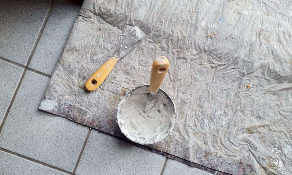 Leider machen mir das Herumsitzen und Lesen wenig Vergnügen, wenn ich weiß, dass der Bereich um die neu eingesetzte Haustür verputzt werden muss. Also rühre ich Spachtelmasse an und verputze.