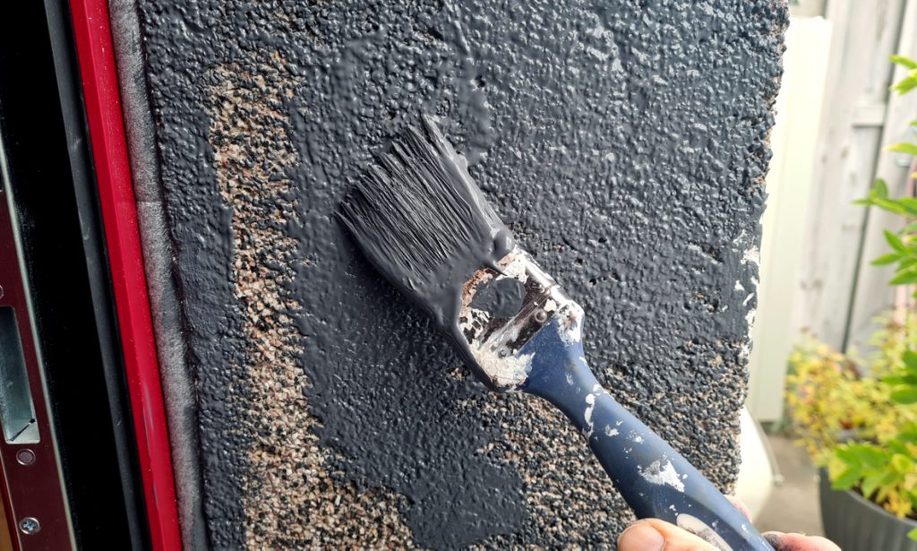 Zuhause geht es mit der Haustür weiter, bei der auch von außen das Mauerwerk beigeputzt werden muss. Die Umrandung der Tür besteht aus einem alten Steinputz aus den Fünfzigerjahren. Der Putz gefällt mir ganz gut, hat aber einige Stellen, an denen in den letzten Jahren Material abgesprungen ist. Meist nicht von alleine, sondern weil jemand etwas unbeabsichtigt dagegen gerammt hat. Kann passieren. Die Lücken im Steinputz lassen sich aber nicht einfach reparieren, darum schließe ich sie mit Spachtelmasse und streiche anschließend alles anthrazit. Und auch das danebenliegende Fenster erhält eine dunkle Umrandung.