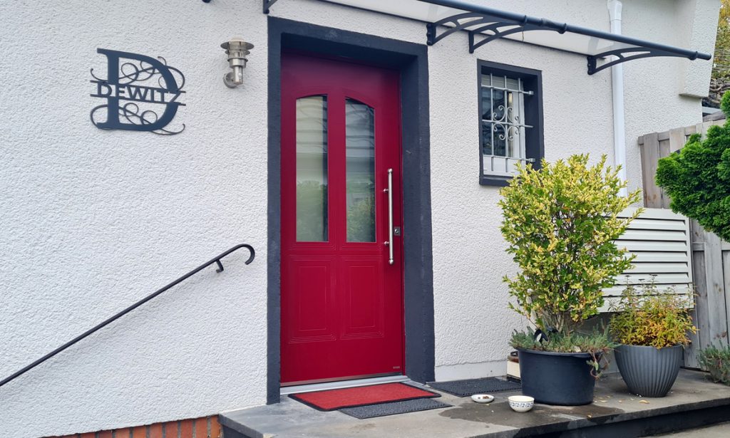 Von außen ist der Türbereich jetzt weitgehend fertig. Das Klingelschild, ebenfalls neu bestellt, fehlt noch.