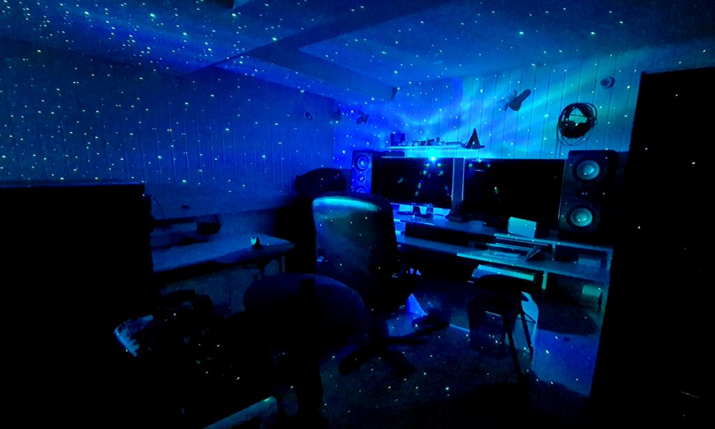Dann kommt die letzte Handlung, auf die ich mich seit dem Beginn des Aufräumens freue. Ich stelle eine Kinderzimmer-Weltraum-Lampe auf, die ich vor kurzem gesehen und spontan für das Tonstudio gekauft habe. Sie macht wunderbares Licht mit strahlenden Sternen und bunten, wandernden Weltraumnebeln. Glitzerndes Discofeeling in ganz langsam und behäbig. Es ist sehr entspannend.