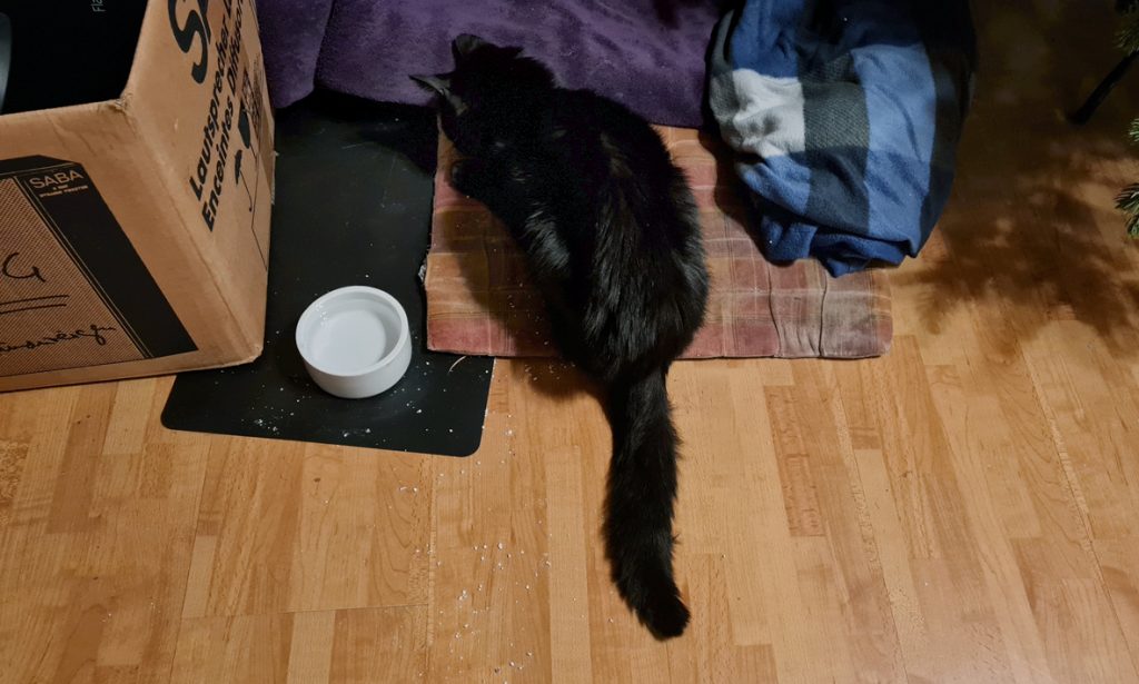 In der letzten Woche schlief unsere Katze viel und fraß wenig. Das ist in den letzten Monaten öfter mal für ein paar Tage geschehen, danach war wieder alles normal. Sie wollte aber auch nicht nach draußen. Das war ungewöhnlich. Sogar in den Nächten blieb sie im Haus, was nie vorher passiert war. Es war allerdings auch eisig kalt, sie ist inzwischen fünfzehneinhalb Jahre alt und mag windige Kälte gar nicht. Am Samstag will sie nicht fressen und schläft viel. Immerhin trinkt sie noch gut. Ich lege ihr im Wohnzimmer Decken hin, damit sie nicht auf dem kalten Laminat liegen muss und stelle ihr Katzenklo in die Nähe. Sie mag es gerne, wenn sie irgendwo liegen kann, aber um sie herum ihre Leute sind. Zwischendurch läuft sie etwas herum, kommt, um sich streicheln zu lassen, trinkt oder geht aufs Katzenklo. Wahrscheinlich frisst sie in der nächsten Woche wieder doppelte Portionen, um alles nachzuholen.