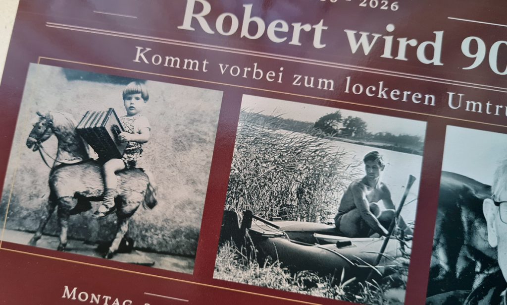 Zuhause stelle ich Fotos und Text für eine Trauerkarte und die Anzeige im örtlichen Werbeblatt zusammen. Das muss jetzt alles schnell gehen. Bei der Trauerkarte entscheiden meine Schwester und ich, dass wir die Bilder nehmen, die auf der Einladung zum Geburtstag abgebildet sind. Sie waren nicht für eine Beerdigung gedacht, aber sie passen auch dort. Ich finde es schön, dass mein Vater die frisch gedruckten Geburtstagseinladungen noch gesehen hat und sie ihm gut gefielen. Beim Blick auf das Foto, das ihn am See in seinem Metzeler-Schlauchboot zeigt, das er zum Segelboot umbauen konnte, grinste er: „Was war ich für ein feines Kerlchen!“ Wenn ich an meinen Papa denke, sehe ich ihn als erstes so vor mir, in Badehose auf einem Boot – ein für ihn ganz typischer und mir sehr vertrauter Anblick -, oder wie er auf Händen im Garten läuft, aber nicht als alten Mann im Sessel.
