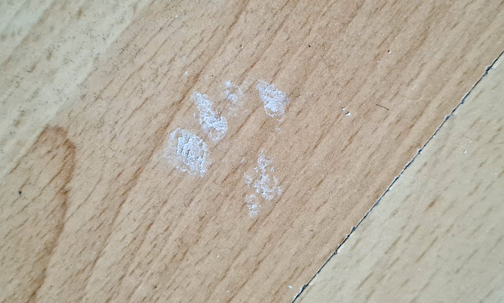 Etwas später entdecke ich auf dem Laminat im Flur einen Pfotenabdruck, den sie am Vorabend mit nassen Katzenstreu an den Vorderfüßen gemacht hat. Ach, wie kann ich denn jemals wieder über diese Stelle putzen? Am liebsten würde ich sie mit Lack versiegeln, aber das sieht ja auch blöd aus. Ich warte erstmal lange mit dem nächsten Putzen ab und werde vorerst sehr vorsichtig drumherum kehren.