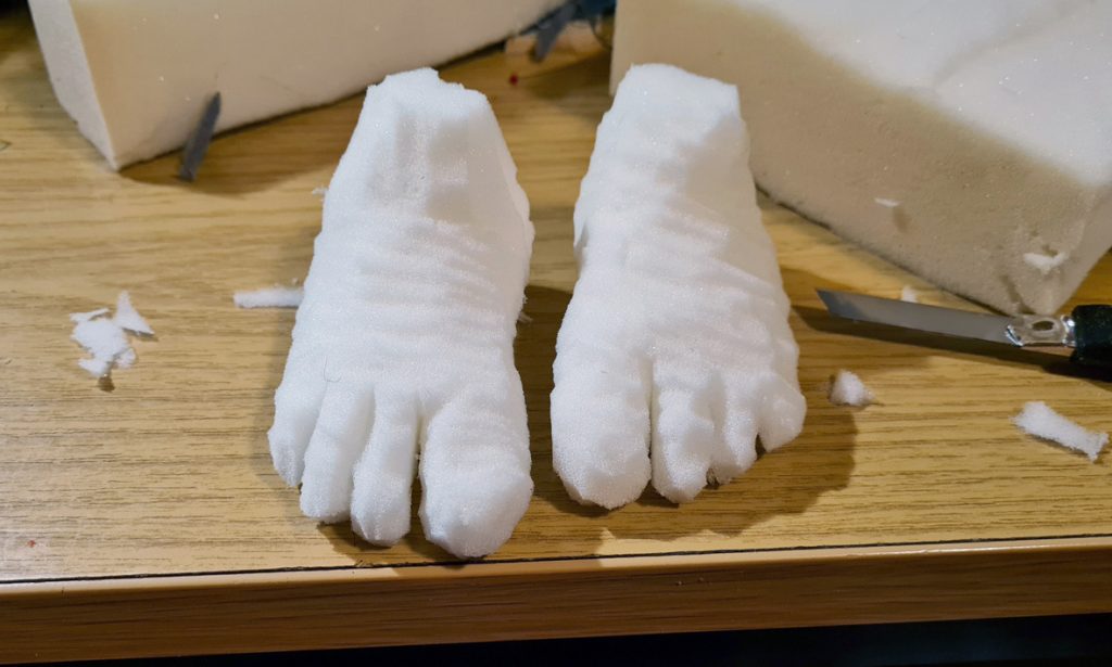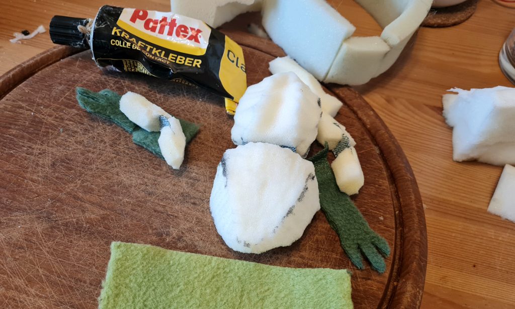 Am Abend versuche ich ein bisschen Kreativzeit nachzuholen. Damit die Zeit der in jedem Zimmer herumfliegenden Schaumstoff-Schnipsel möglichst bald vorüber ist, mache ich einen Schnitzmarathon. Zwei Arme, zwei Hufe, zwei Beine, zwei Füße und ein Tortenstück entstehen. Alles für das neue Puppenstück. Am Schluss kehre ich viele Schnipsel zusammen, klopfe sie von meiner Kleidung, sammle sie von der Treppe und habe jetzt nur noch Näharbeit vor mir.