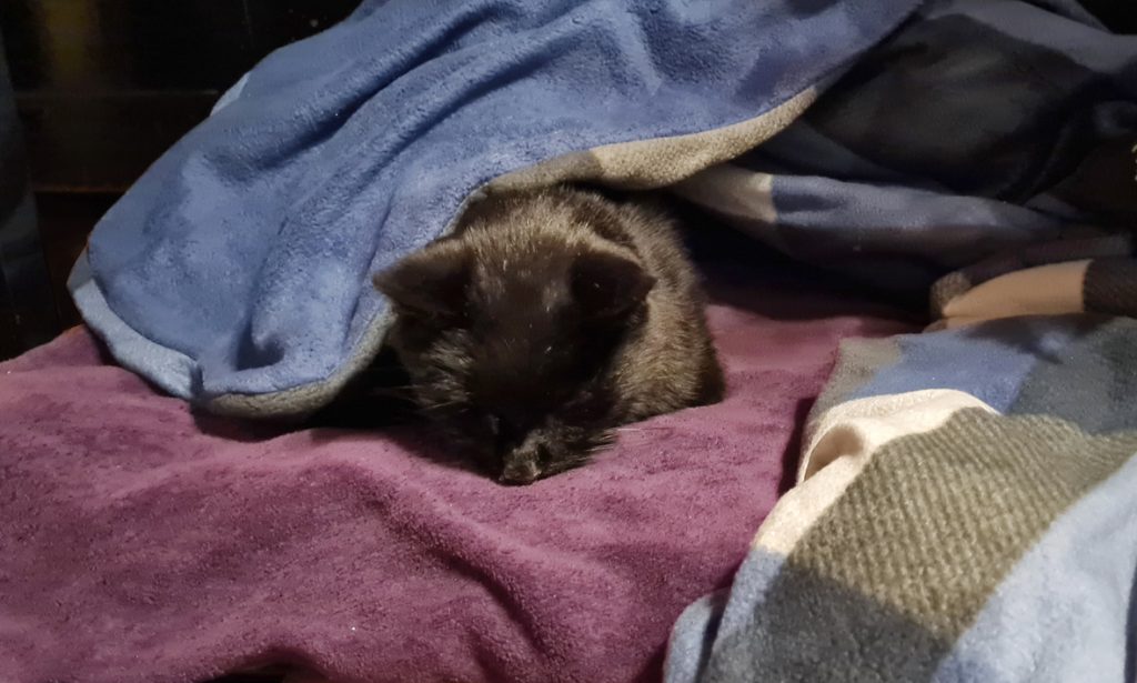 Die Katze schläft weiterhin viel. Manchmal fühlt sie sich kühl an, dann decke ich sie leicht zu, was ihr gefällt. Zumindest so lange, bis es ihr zu warm wird. Ich halte sie im Blick. Sie wirkt schlapp, das gefällt mir nicht. Morgen will ich sofort mit ihr zur Tierärztin.