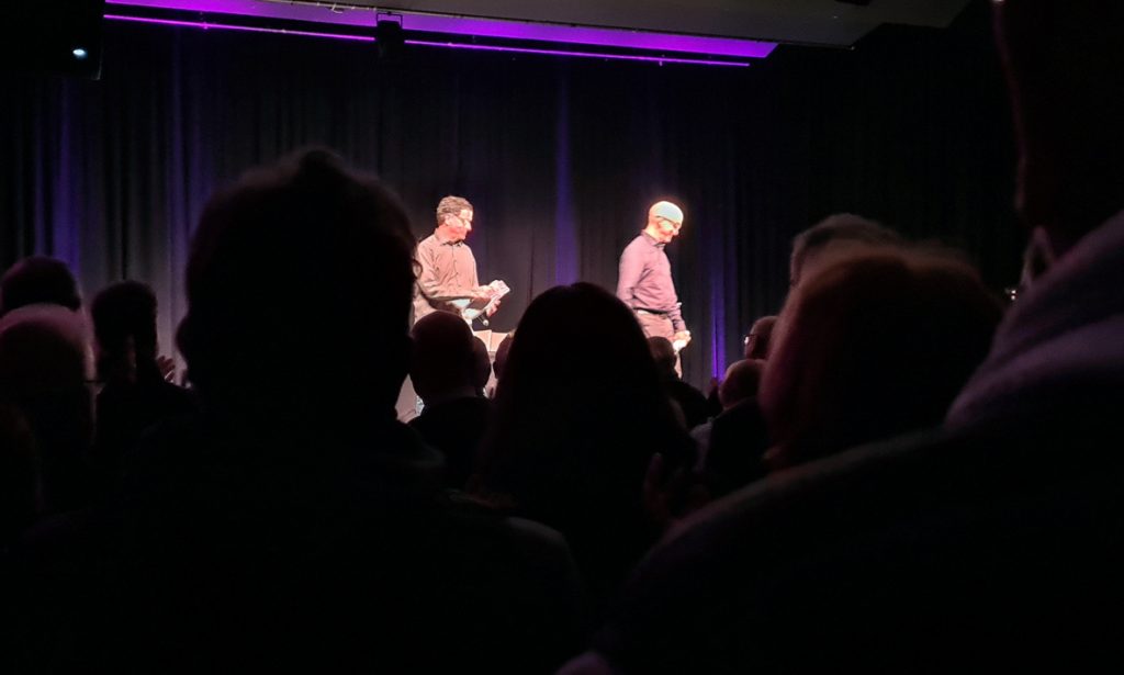 Es ist ein sehr lustiger Abend mit zwei sehr tollen Leuten auf der Bühne. Ich plane ein Foto beim abschließenden Verbeugen, aber genau in diesem Moment gibt es Standig Ovation und vor mir sind plötzlich nur noch Köpfe und Schultern zu sehen. Endlich gibt es eine Lücke, da gehen die Akteure schon ab.