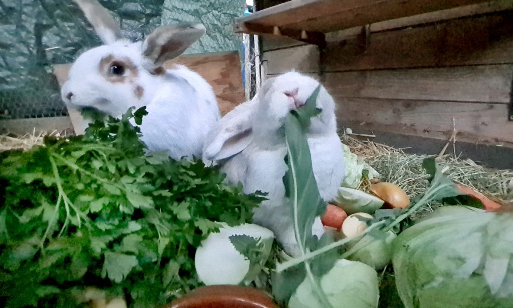 Früh am nächsten Morgen habe ich diverse Haushaltssachen und ein Sofa im Auto und möchte nach Frankfurt losfahren, um alles dem Sohn zu bringen. Kurz vor der Abfahrt gehe ich in den Garten, um die Kaninchen zu füttern und sehe, dass es dem Kaninchen Paul gar nicht gut geht. Bis gestern atmete er zwar immer noch leise hörbar, hoppelte aber recht munter herum und fraß mit gutem Appetit. Jetzt holt er plötzlich wieder schwer Luft und sieht aufgeplustert aus. Er möchte nichts fressen, sondern nur an seine Kaninchenfreundin gelehnt mit geschlossenen Augen sitzen. Oh je. Das sieht nicht gut aus. Da kann ich doch jetzt nicht wegfahren! Sollten sich seine Atemprobleme verstärken, muss ich mit ihm zur Tierärztin, damit er sich nicht quält. Der Gatte fährt los, um die Lieblingspetersilie zu kaufen und ich plündere den winterlichen Salbeibusch, aber Paul kaut nur mal kurz und appetitlos. Er wird den Tag nicht überleben, vermute ich. Ach, es kommt aber auch echt gerade alles zusammen. Pauls Kaninchenfreundin freut sich, dass so viel Grünzeug da ist und frisst maschinenmäßig alles rein, während er nichts haben will und sich nur fest an sie kuschelt.