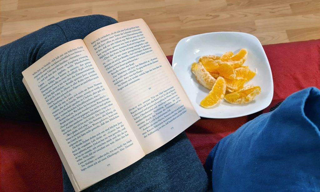 Gute zwei Stunden später bin ich angekommen, trage mit dem Sohn zusammen vollgepackte Tüten und die drei Sofateile nach oben, wir rücken Bücherschränke um, schrauben das Sofa zusammen und finden das Ergebnis wohnlich und sehr gut. Beim „Bowlwerk“ essen wir anschließend eine heiße und kräftige Rahmensuppe, danach habe ich frei. Kurz denke ich, dass ich doch einen Laptop und den Text des Puppentheaterstück hätte mitnehmen können, damit ich es final bearbeiten kann. Aber das wäre ja total blöd gewesen. Ich muss auch mal aushalten, rumzuchillen. Bis zum Abend auf dem Sofa liegen, lesen, Apfelsine essen, Tee trinken und fernsehen ist doch genau das, was ich brauchen kann.
