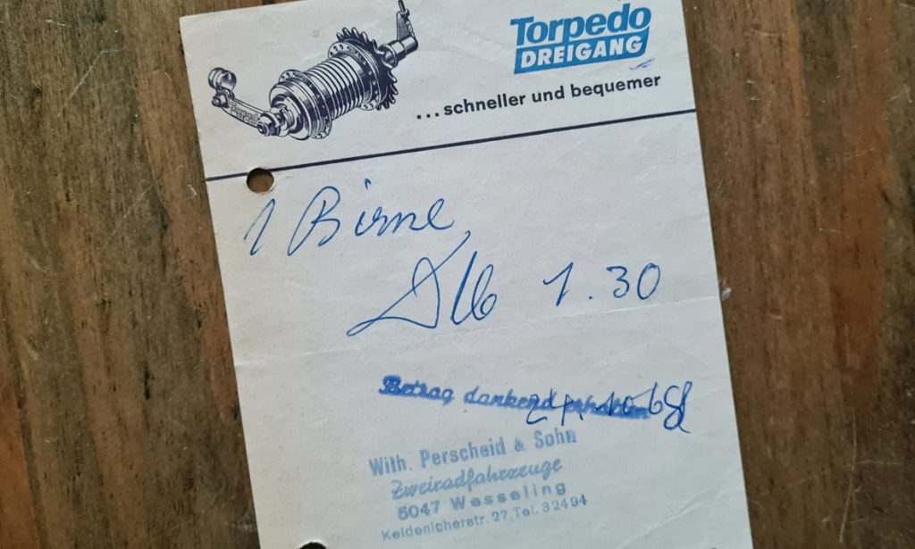 Von 1968 ist eine Quittung über eine Fahrradlampenbirne für 1,30 DM. Da ist nicht nur der alte Zettel mit einer Werbung für eine damals supermoderne Dreigangschaltung interessant. Es freut mich besonders, dass er vom Zweiradladen „Wilh. Perscheid & Sohn“ ist, die Opa und Papa vom wunderbaren Zeichner Martin Perscheid waren. Der Opa und der Papa waren für mich damals „der alte Herr Perscheid“ und „Onkel Hans“. Wir waren nicht verwandt, aber damals wurden die engen Freunde der Eltern oft Nenn-Onkel und Nenn-Tanten für die Kinder. Ich sehe beide noch vor mir und weiß, wie lustig ich es als Kind fand, dass „Onkel Hans“ im Gesicht ganz genau wie „der alte Herr Perscheid“ aussah, nur in jünger.