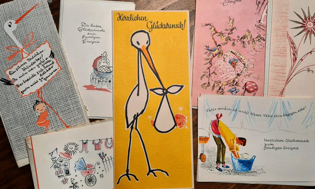 Aber schon wieder mache ich entzückende und überraschende Funde. In einer großen Pappschachtel sind von meiner Mutter seit vielen Jahren aufgehobene Briefe und Grußkarten zu verschiedenen Anlässen. Beginnend bei der Verlobung meiner Eltern über ihre Hochzeit, die Geburten der zwei Töchter bis hin zu den Trauerkarten zum Tod ihrer eigenen Eltern. Alles als kleine Päckchen mit Kordeln umwickelt. Das ist nicht nur private Familiengeschichte – interessant, wer da alles geschrieben hat, wen ich sofort zuordnen kann und wie viele Namen ich nicht kenne -, sondern auch grafische und typografische Zeitgeschichte. Zur Hochzeit 1960, die auf den Karten noch durchgehend „Vermählung“ genannt wird, gab es pastellige Farben, schön grafische Schriften und die typisch leichten, skizzenhaften Illustrationen der Zeit.