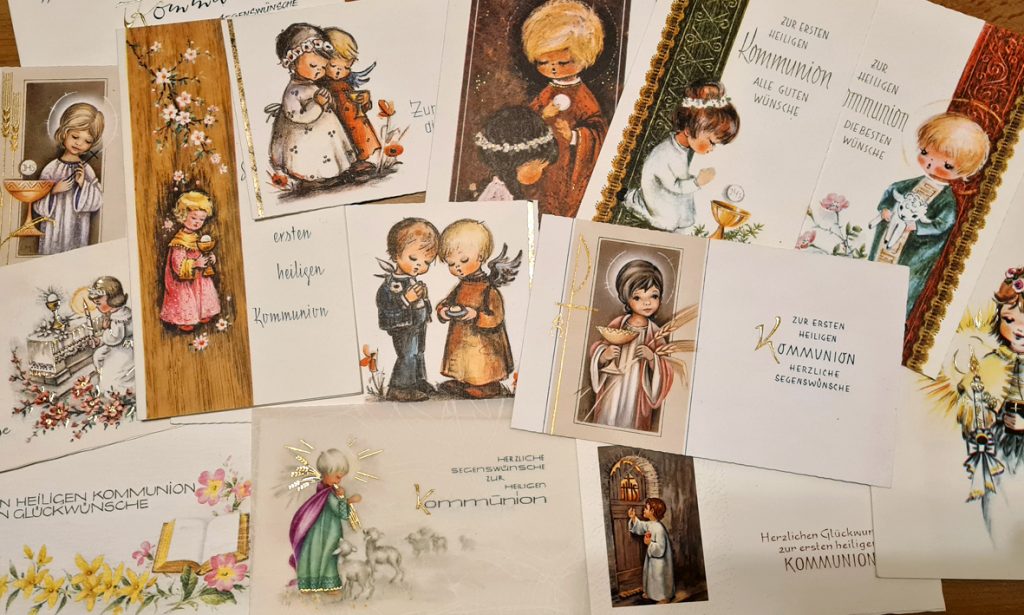 Zehn Jahre später, in den frühen Siebzigern, hatte sich der Illustrationsstil total geändert. Es gab große, kugelrunde Köpfe, kleine Münder und kaum sichtbare Nasen. Kindchenschema in sehr kitschig. Das war die Zeit der populären „Big Eyes“-Bilder von Margaret Keane, die sich bis zu den Karten zu meiner Kommunion auswirkten. Die Illustrationen und die bräunlichen Farben finde ich schlimm, die grafischen Veränderungen der Zeit aber spannend.