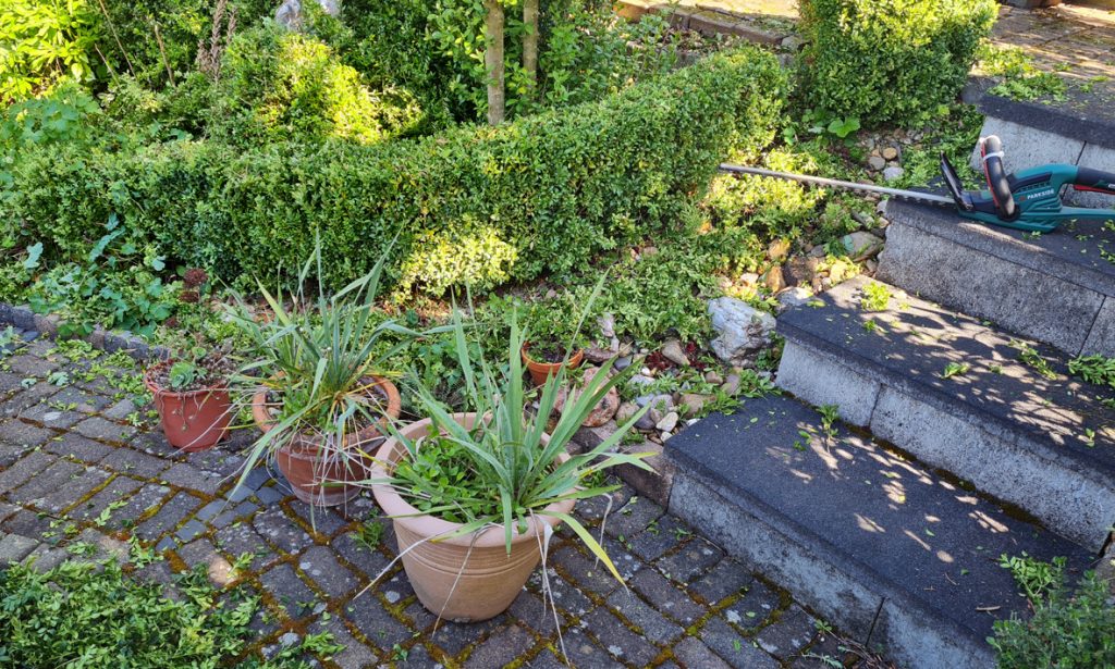 Im Garten schneide ich die Buchsbäume in ungefähre Form. Auch wenn mich der Zünsler nervt, mag ich meine Buchsbäume doch sehr. Und das auch, weil sie in meinem trockenen Garten problemlos wachsen.