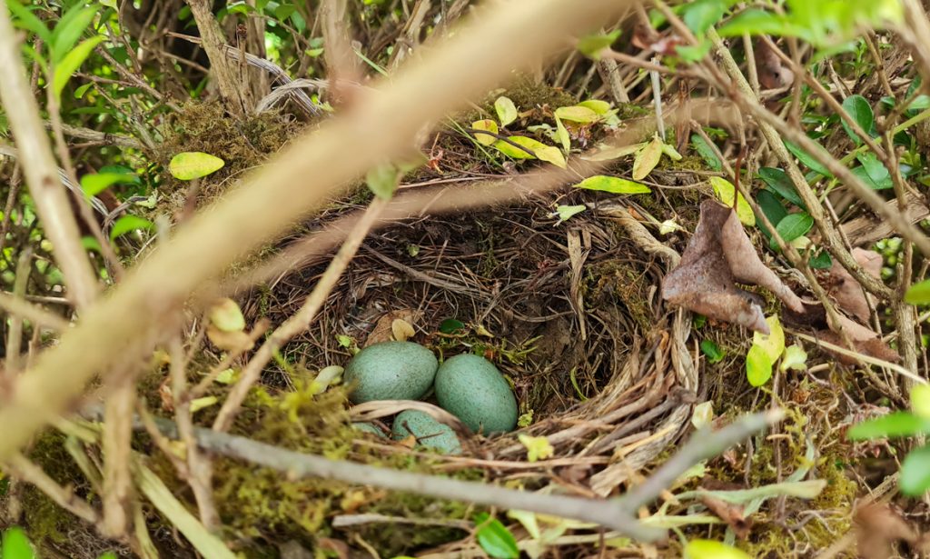 Weil ich gerade am Kürzen bin, begebe mich auch an die oberen, quer übereinander hängenden Austriebe einer groß gewachsenen Heckenkirsche. Als ich die Hälfte der Zweige gekürzt habe, entdecke ich im Inneren ein Amselnest mit grünen Eiern. Oh, nein! Genau das ist der Grund, warum man nur bis zum 1. März Büsche schneiden soll. Die herausragenden Triebe darf ich zwar offiziell immer noch abschneiden, aber auch damit beschädige ich jetzt ungewollt das gewachsene Schutzdach des Nestes.