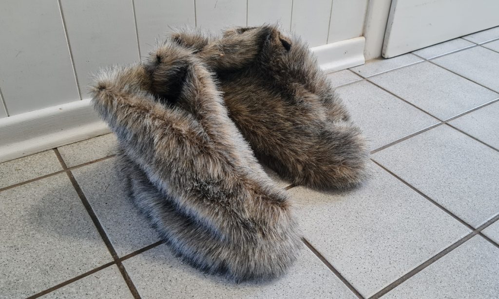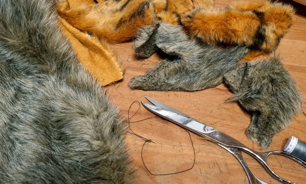 Beim Arbeiten achte ich aber darauf, dass ich nicht zu kleinteilig zuschneide, um einen Teil des Plüsches später wieder auftrennen und noch für Puppen verwenden zu können. Schließlich brauche ich meine Steinzeitkleidung nur für wenige Stunden. Es ist schon idiotisch: Ich nähe länger daran, als ich sie tragen werde. Aber ich besitze jetzt Schuhe, die ich auch beim Thema „Nordpol“ tragen könnte. Ich vermute, es gibt gar kein Nordpol-Krimidinner.